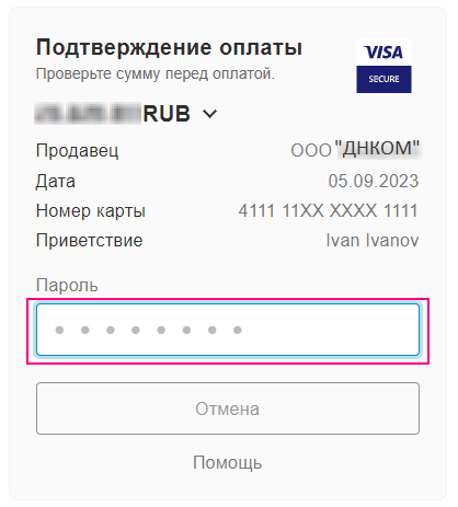 19. Внести пароль для подтверждения оплаты, который поступит на номер телефона, указанный при оформлении заказа.