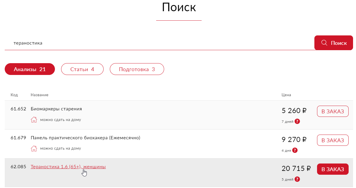 5. Если исследование определено, кликнуть на иконку «В ЗАКАЗ».