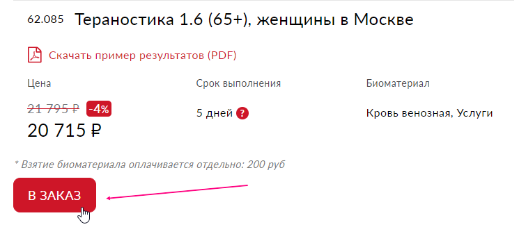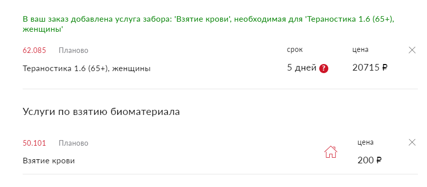 При необходимости в корзину автоматически может добавиться услуга по взятию биоматериала.